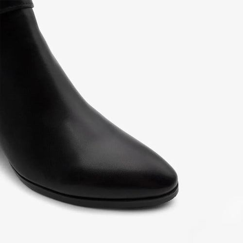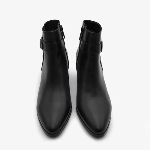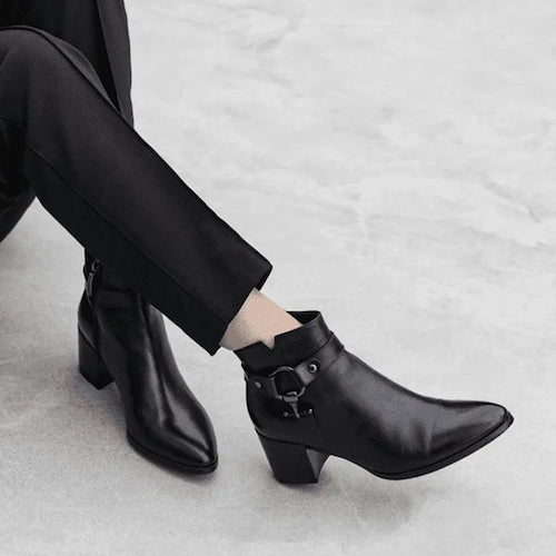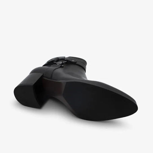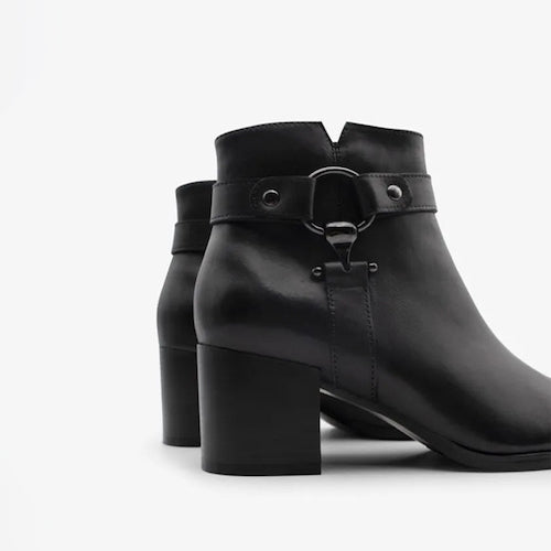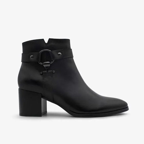 Botín de caña baja de la marca Regarde Le Ciel. Fabricado en piel color negro. Detalle de correas y hebilla color plata ahumada en el lateral exterior. Tacón bloque de altura media. Cierre mediante cremallera situada en la parte lateral interior. Suela de goma.