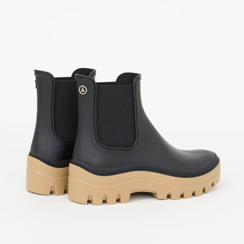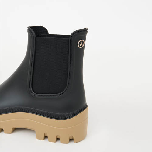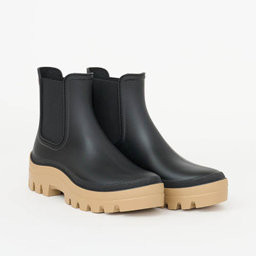 Bota de agua de la marca TANTÄ. Fabricada en PVC bicolor negro con piso en beige. Interior 100% poliéster. Modelo impermeable en acabado mate. Panel elástico en los costados, no impermeable. Detalle de lago en la parte trasera. Plantilla extraíble. Forro textil. Suela interior en poliamida.