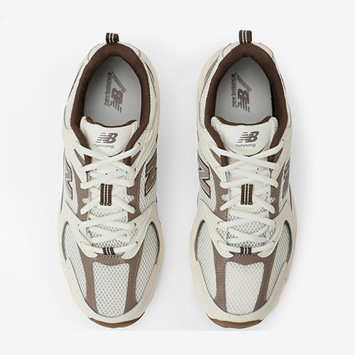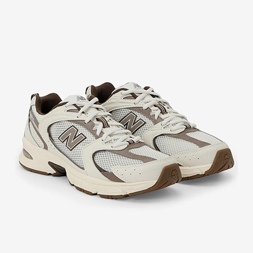 Deportiva New Balance 530. Fabricada en combinación de malla en color blanco y piezas de corte en piel marrón. Modelo retro que combina el estilo de running clásicas con tecnología moderna. Su entresuela ABZORB absorbe los impactos mediante una combinación de amortiguación y resistencia a la compresión. Cierre con cordón regulable para un ajuste personalizado.