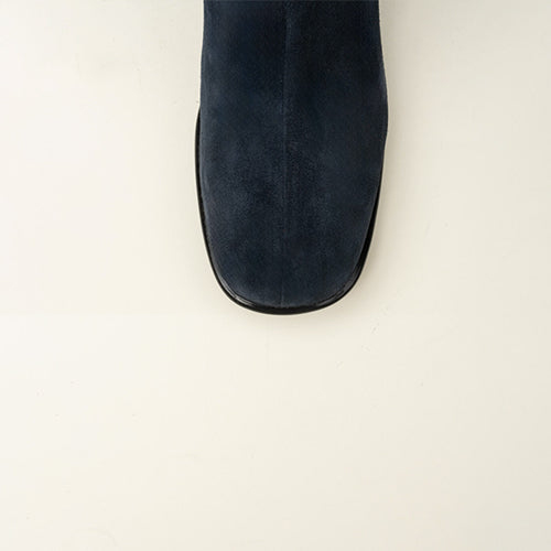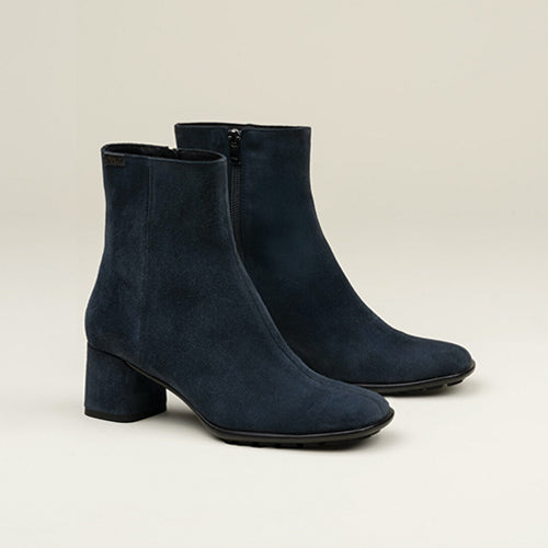Botín de tacón medio de Gaimo. Fabricado en suave piel de serraje en color azul. Incorpora una cremallera lateral que facilita el calce sin perder estilo. Su silueta cuidada y minimalista ofrece versatilidad para elevar cualquier look. Un diseño elegante y contemporáneo.