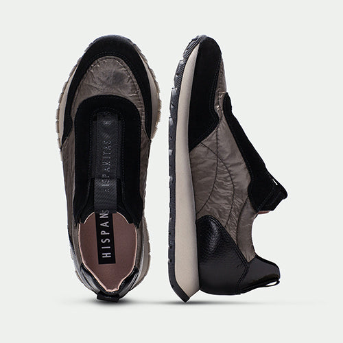 Zapato casual de la marca Hispanitas. Modelo deportivo slip on con banda elástica en el empeine que facilita el calce. Piso de 3 cm de goma termoplástica. Elaborado en piezas de corte nobuk color negro combinado con nylon en color gris. Forro interior de origen no animal, 100% transpirable y termorregulador.