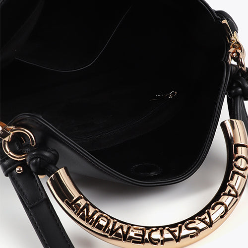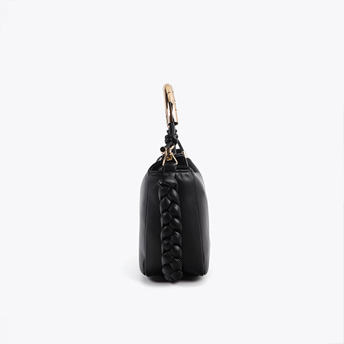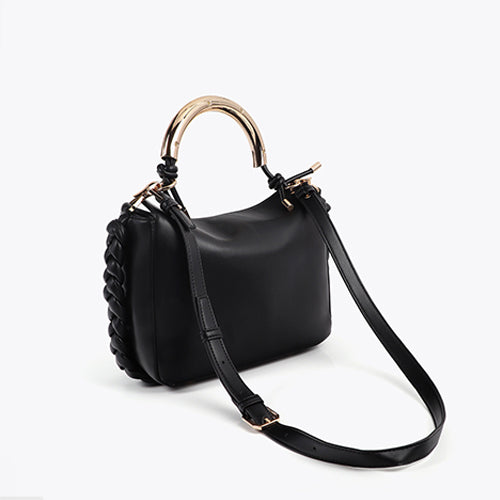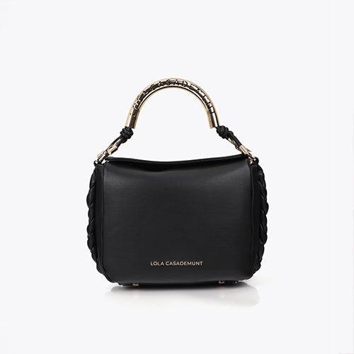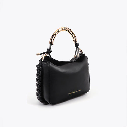 Bandolera efecto piel en color negro de la marca Lola Casademunt. Asa metalizada personalizada y logotipo grabado. Incluye correa ajustable y detalles trenzados en los laterales al tono. Cierre magnético.