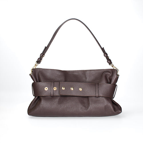 Bolso de hombro de la marca my-best bag. Fabricado en piel color marrón. Detalle de tira alrededor del modelo con pieza tipo eslabón y tachas doradas. Asa de hombro extraíble. Forro interior textil en color teja. Bolsillo interior con cremallera. Detalle de marca en color dorado en la parte frontal.