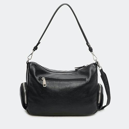 Bolso bandolera de la marca Binnari. Confeccionado en pu soft y detalles en pu alta calidad, Cierre mediante cremallera. Modelo en color negro. Incluye bolsillo en la parte delantera y posterior, ambos con cremallera. Así como, dos bolsillos pequeños laterales también con cremallera. Tiene 2 posiciones: bandolera y bolso de hombro gracias a su asa trenzada extraíble al tono. Bandolera ajustable y extraíble. Detalle de marca en la parte frontal.