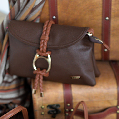 Cierre mediante solapa ovalada con clip. Acabado con tira trenzada en color cuero y aplique decorativo dorado. Por dentro, sorprende con dos compartimentos independientes, pensados para que tengas todo a mano y bien organizado.