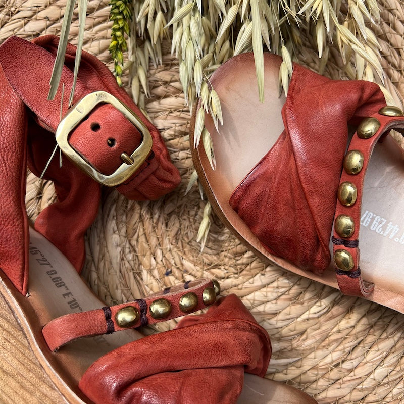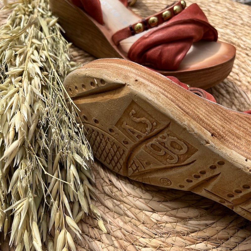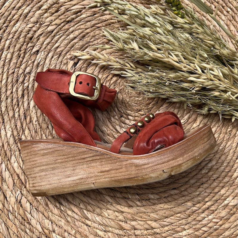 Sandalia de plataforma y cuña de la marca AS98. Fabricada en piel color teja. Modelo de tiras gruesas envolventes. Detalle de tachas en color dorado. Cierre mediante hebilla ajustable a la altura del tobillo. Plataforma y cuña en material estilo natural al tono. Suela de goma con grabado de logotipo de la marca.