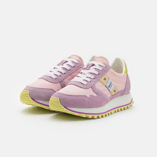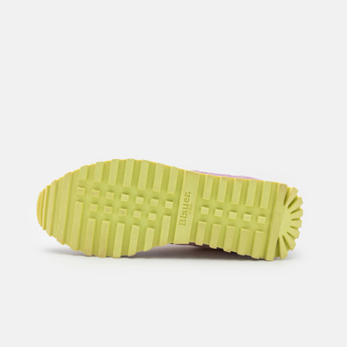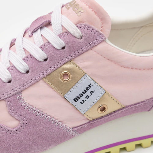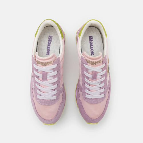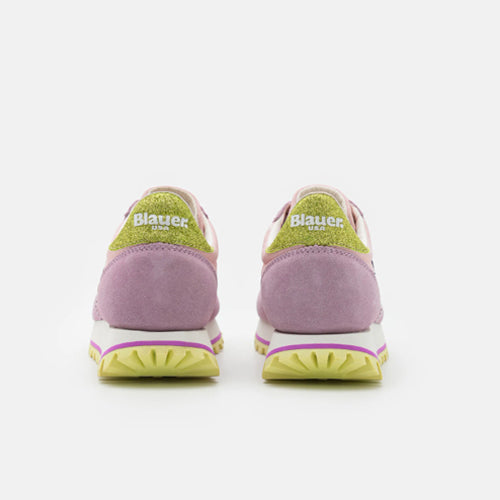 Deportiva de la marca Blauer en color rosa pastel. Fabricada con piezas de corte en material tejido técnico y piel nobuk. Combinación de colores en malva y verde flúor. Contrafuerte en glitter verde flúor. Detalle de la marca en el lateral sobre tira en color platino y en el contrafuerte del modelo. Piso tricolor. Suela de goma.