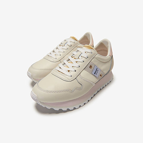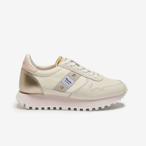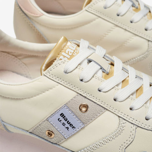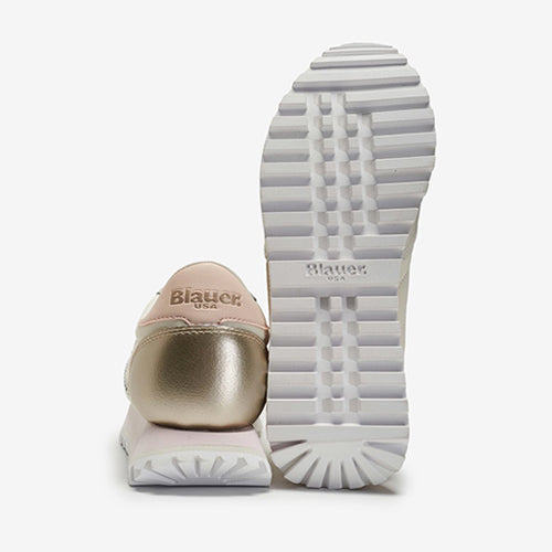 Deportiva de la marca Blauer en color beige. Fabricada con piezas de corte en material tejido técnico y piel nobuk. Detalles en color nude y platino. Detalle de la marca en el lateral y contrafuerte del modelo. Piso tricolor. Suela de goma.