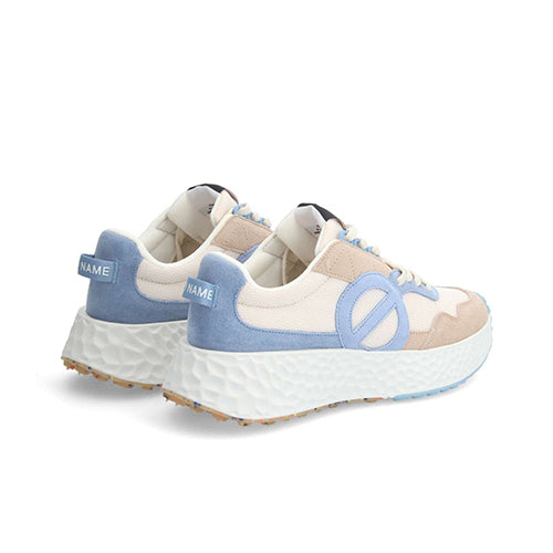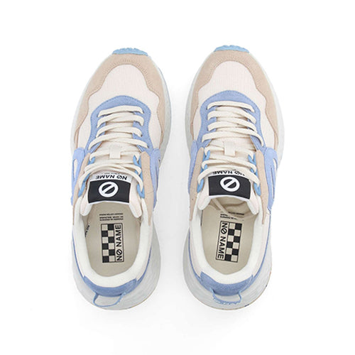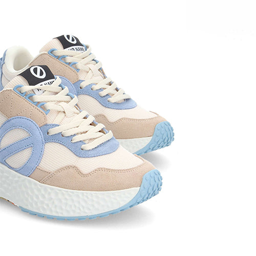 Deportiva de cordones de la marca NO NAME. Fabricada en textil con un 51% poliéster reciclado certificado GRS, combina piezas de corte en piel nobuk color beige y color celeste. Detalle de anagrama en los laterales. Suela volumen EVA en color blanco con tacos, extremadamente cómoda. Plantilla y suela recicladas para una zapatilla con un impacto ambiental limitado. Forro de algodón y poliéster orgánico con certificación GOTS. Plantilla extraíble de algodón orgánico con certificación GOTS. Lengüeta en el talón con logotipo. Incluye un segundo par de cordones.