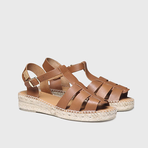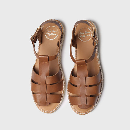 Alpargata plana en piel color cuero de la marca Toni Pons. Diseño estilo cangrejera con cierre con hebilla ajustable que permite una mayor sujeción al pie. Cuña de yute y suela de goma antideslizante. Plantilla interior forrada en piel para mayor comodidad. Diseño cosido a mano en España. Uno de nuestros clásicos para el verano, fresco y cómodo.