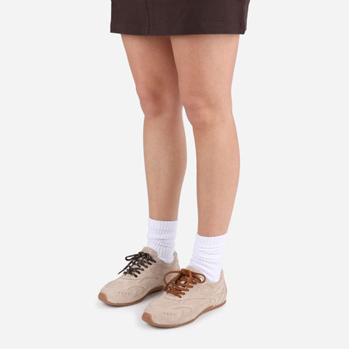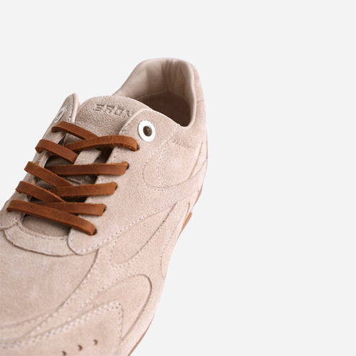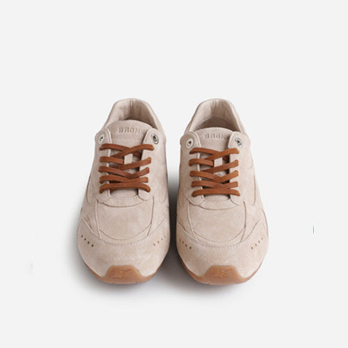Deportiva urbana de la marca BRONX. Fabricada en piel nobuk color taupe. Cierre mediante cordones. Incluye dos pares de cordones: uno de cuero y otro de algodón redondeado más deportivo. Plantilla de piel y suela ultra-ligera. Ideal para un look dinámico y moderno.