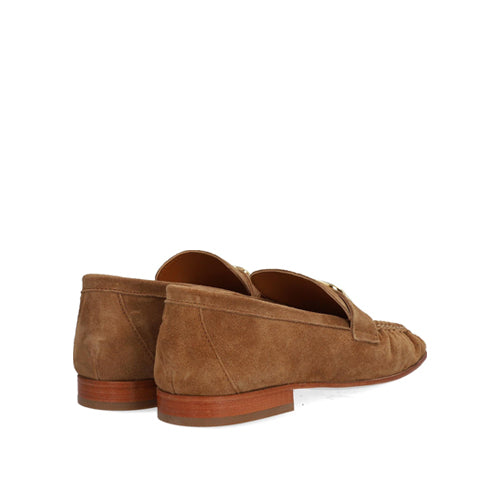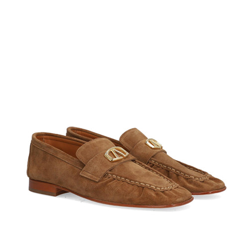 Mocasín plano de la marca Alpe. Fabricado en piel nobuk color cuero. Adorno dorado en la parte del antifaz. Detalle de fruncido en la parte delantera. Modelo de puntera cuadrada. Suela antideslizante. Ideal para la época de entretiempo.