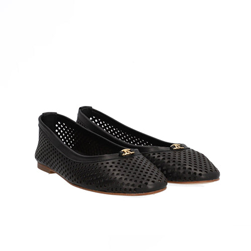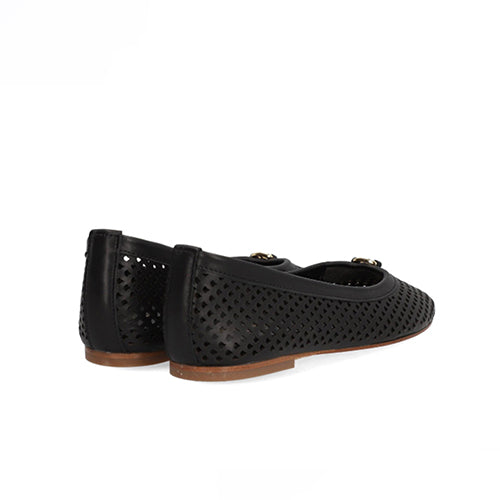 Bailarina plana de la marca Alpe. Fabricada en piel color negro. Modelo troquelado con pequeño detalle dorado en la parte del escote. Diseño de puntera redonda. Suela de goma antideslizante.