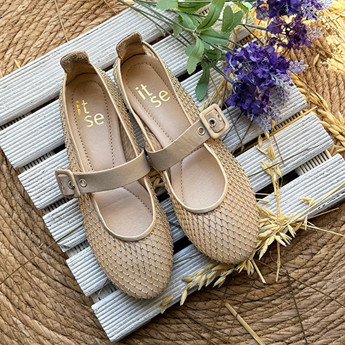 Zapato plano estilo merceditas de la marca itse. Fabricada en material textil transparente en color beige. Detalle de pedrería a lo largo del modelo. Tira de piel al tono con hebilla ajustable para una mayor sujeción. Suela de goma.