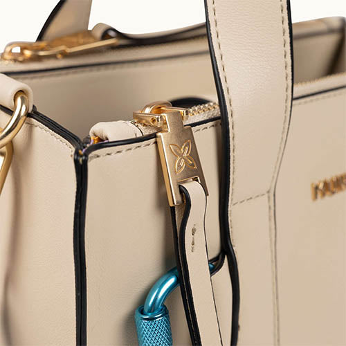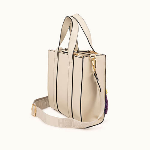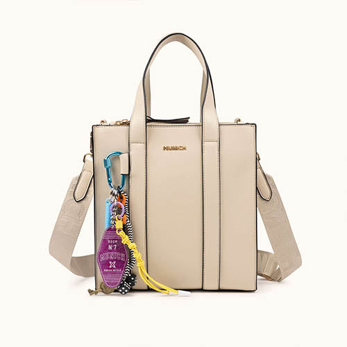 Bolso crossbody estilo tote de la marca Munich. Modelo de silueta vertical que destaca por su acabado en PU color crema, ofreciendo una estética limpia y moderna para tu día a día. Su diseño funcional incluye un cierre de imán de acceso rápido, bolsillo frontal y un interior organizado con compartimentos con cremallera. La versatilidad es clave gracias a sus asas de mano y a la bandolera logotipada de nylon ajustable y extraíble que permite cruzarlo para mayor comodidad. El toque de tendencia lo aportan sus exclusivos charms multicolores extraíbles, que contrastan perfectamente con el tono neutro del bolso.