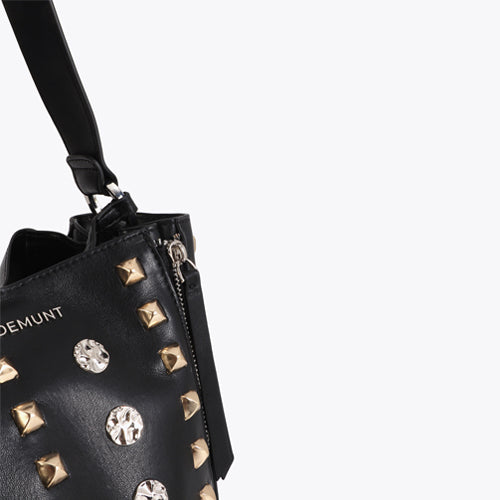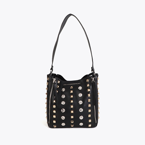 Bolso de hombro de la marca Lola Casademunt. Fabricado en cuero sintético de alta calidad en color negro. Modelo estilo rockero con un diseño atrevido con tachas doradas y brillantes. Cierre mediante clip. Incluye correa ajustable para poder llevarlo colgado y neceser para llevar tus pertenencias.